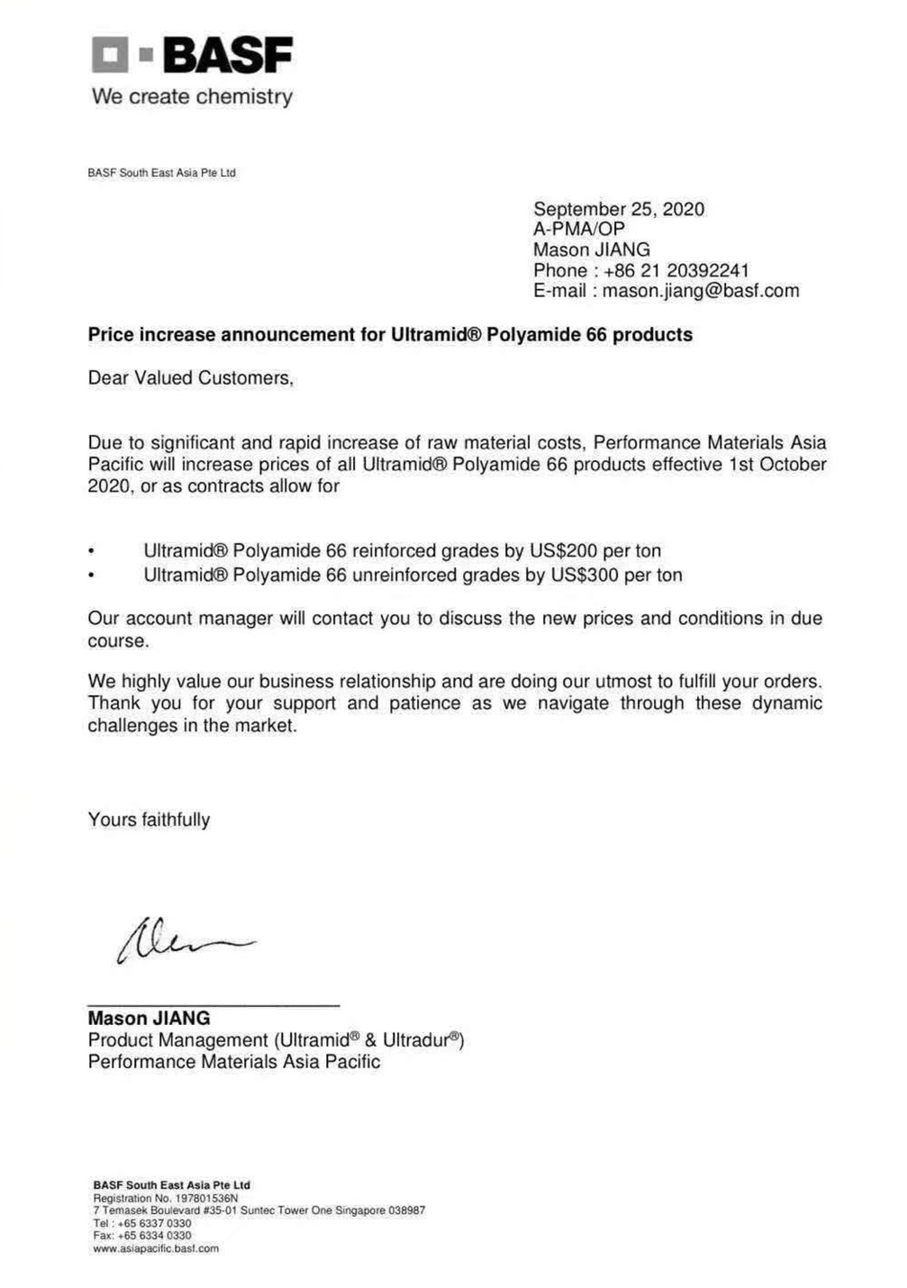 BASF 巴斯夫发布Ultramid PA66涨价通知函,每吨上涨200美金起,新价格从2020年10月1日开始执行,