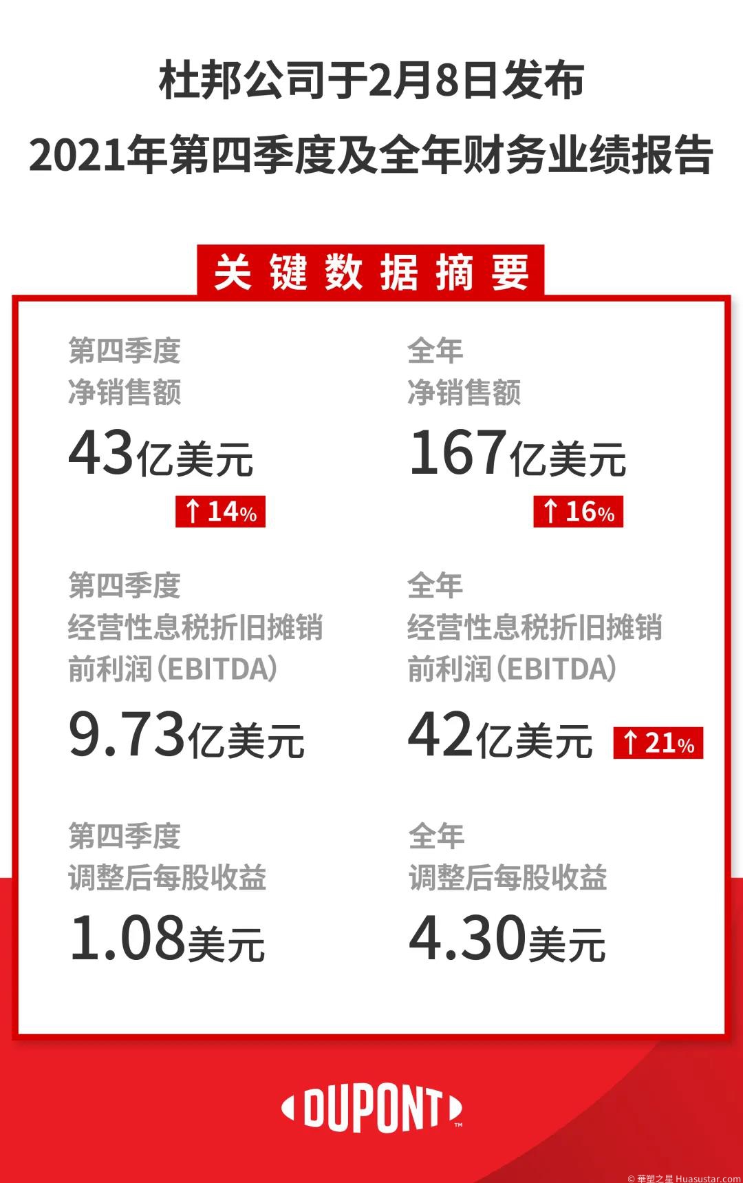 Dupont杜邦杜邦公司2021年第四季度及全年财务业绩发布,Q4销售额43亿美元,2021全年营收167亿美元,全年净利润42亿美元,同比增长21%