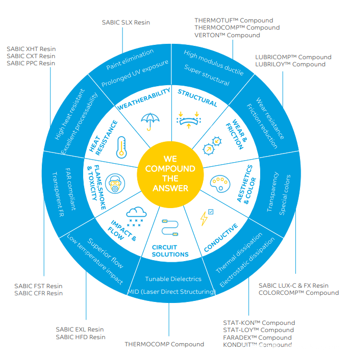 LNP产品组合现在还利用广泛的SABIC聚碳酸酯共聚物,具有出色的复合性能。 与通用聚碳酸酯相比,这些共聚物具有独特的价值,包括具有高耐热性(XHT和CXT),低温延展性(EXL),优异的流动性和延展性(HFD)的树脂产品组合,适用于户外应用的长时间抗紫外线暴露 (SLX),薄规格(CFR)的透明阻燃性,以及用于大众运输(FST)的优异的火焰,烟雾和毒性。
